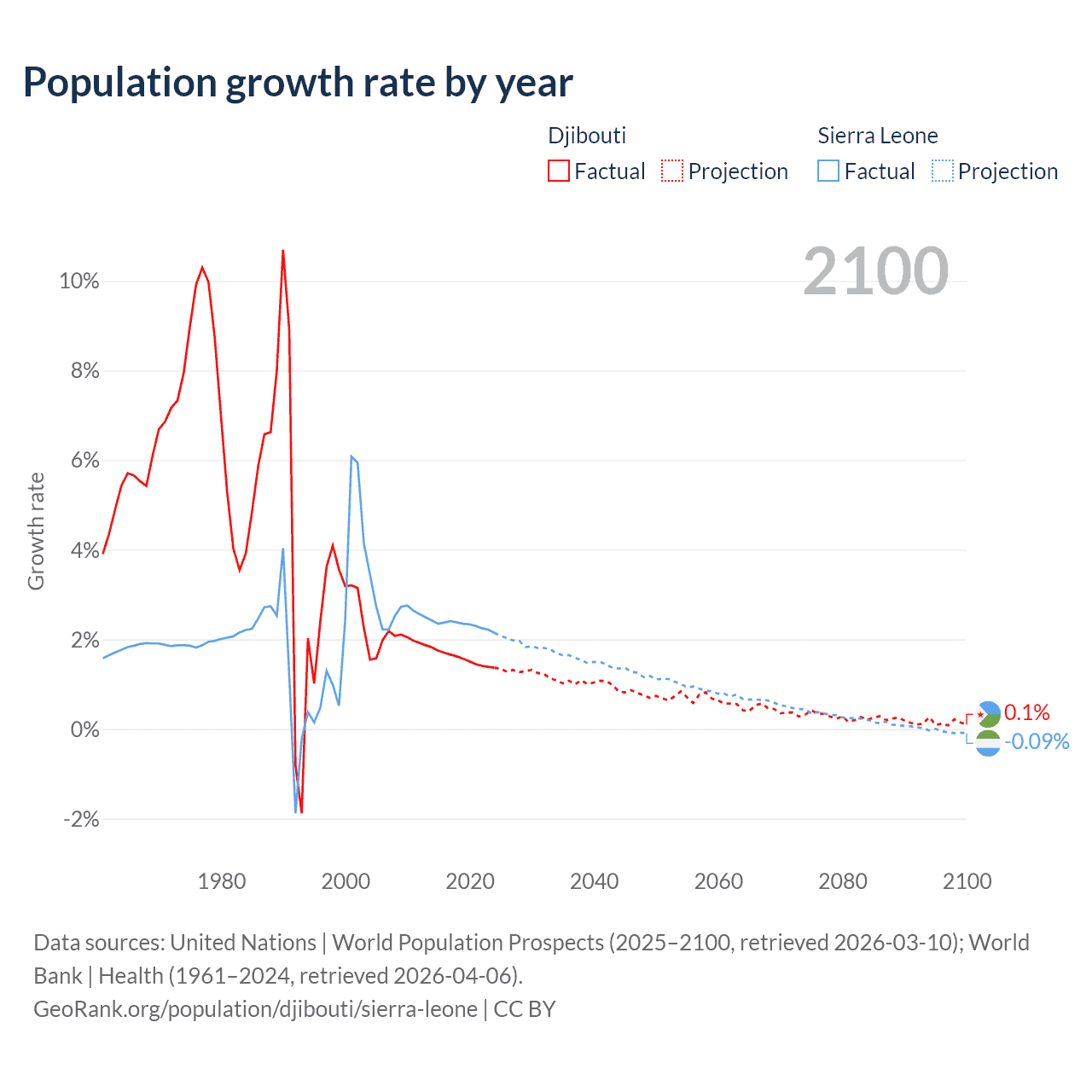 - For the last 10 years, Djibouti has had an average growth rate of +1.57% per year vs +2.32% in Sierra Leone.