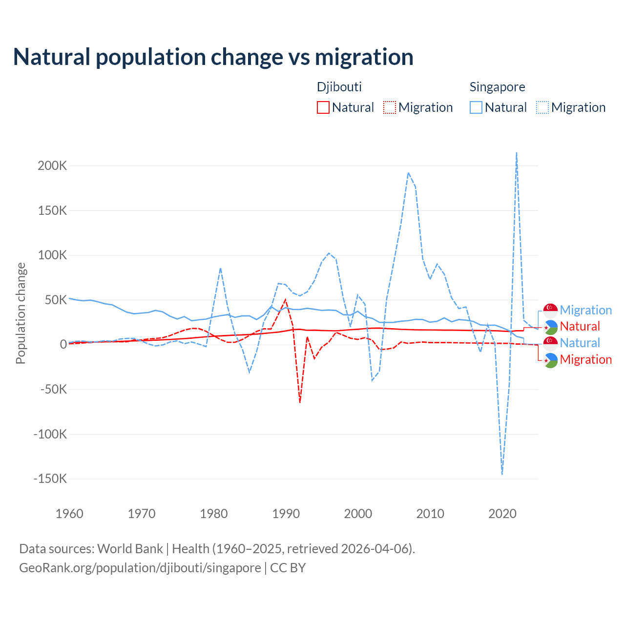 Over the last 10 years, 92.1% of the population change in Djibouti is from natural causes (a gain of 153,892 people) and 7.87% is from migration (a gain of 13,138 people). In Singapore 54.8% is from natural causes (a gain of 195,953 people) and 45.2% is from migration (a gain of 161,805 people).