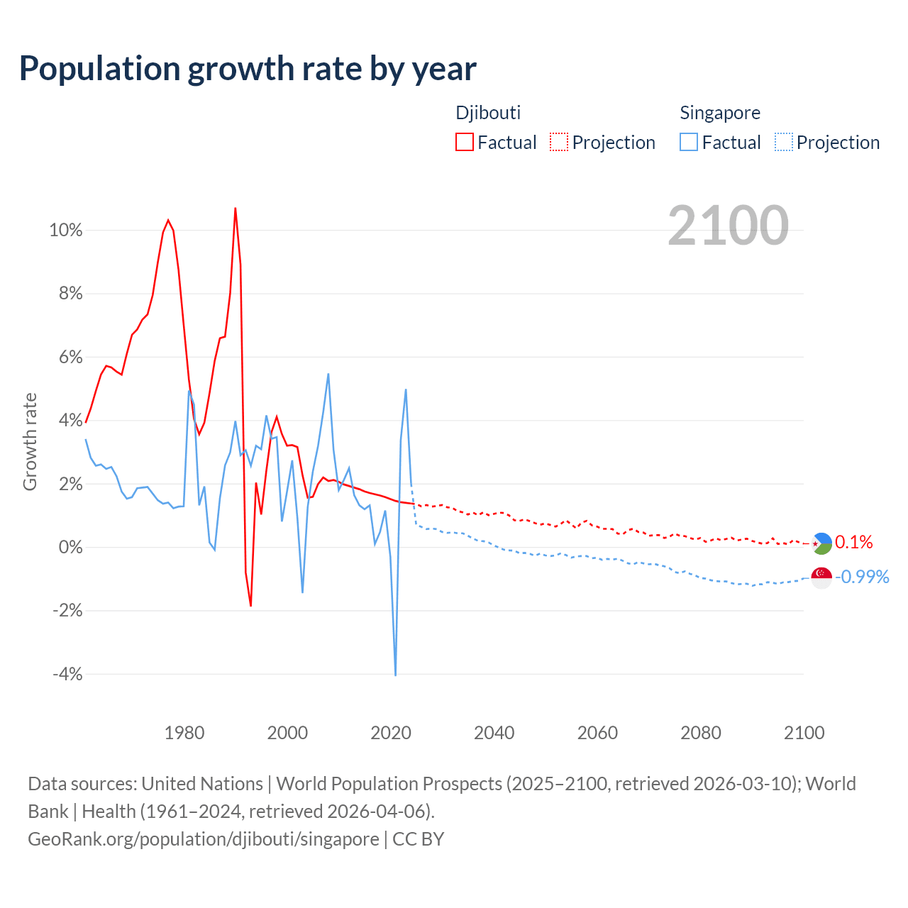 - For the last 10 years, Djibouti has had an average growth rate of +1.57% per year vs +1.04% in Singapore.