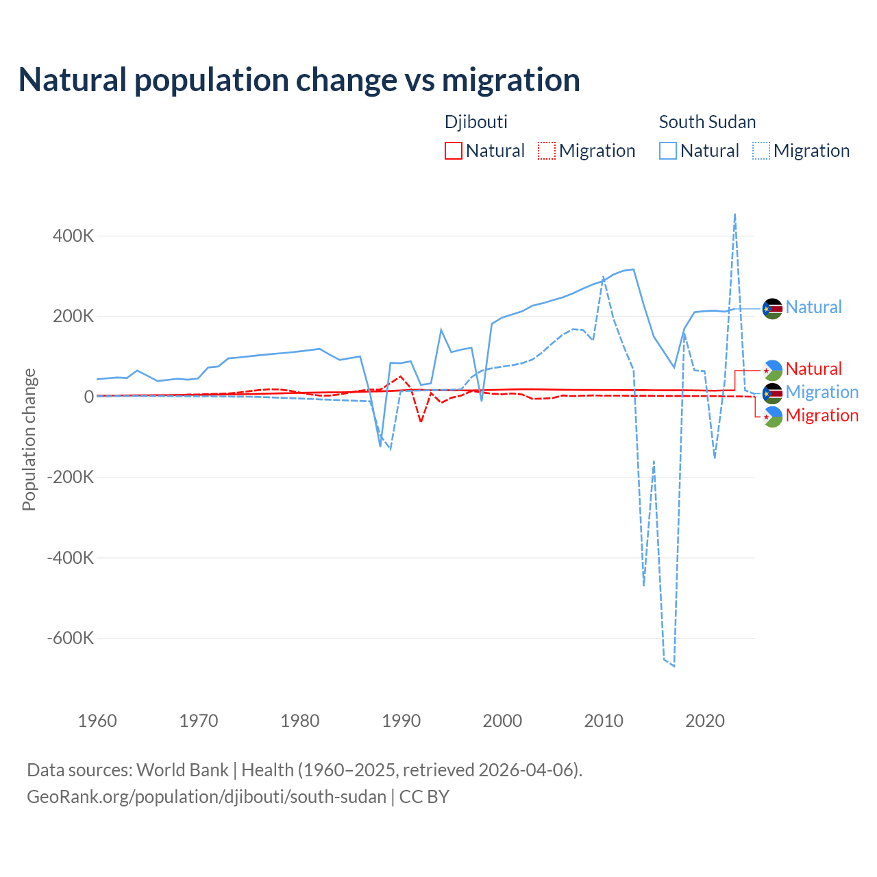 Over the last 10 years, 92.1% of the population change in Djibouti is from natural causes (a gain of 153,892 people) and 7.87% is from migration (a gain of 13,138 people). In South Sudan 57.4% is from natural causes (a gain of 1,792,135 people) and 42.6% is from migration (a loss of 1,329,606 people).