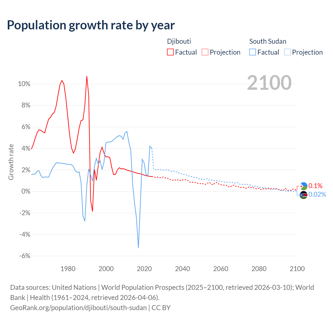 - For the last 10 years, Djibouti has had an average growth rate of +1.57% per year vs +0.65% in South Sudan.