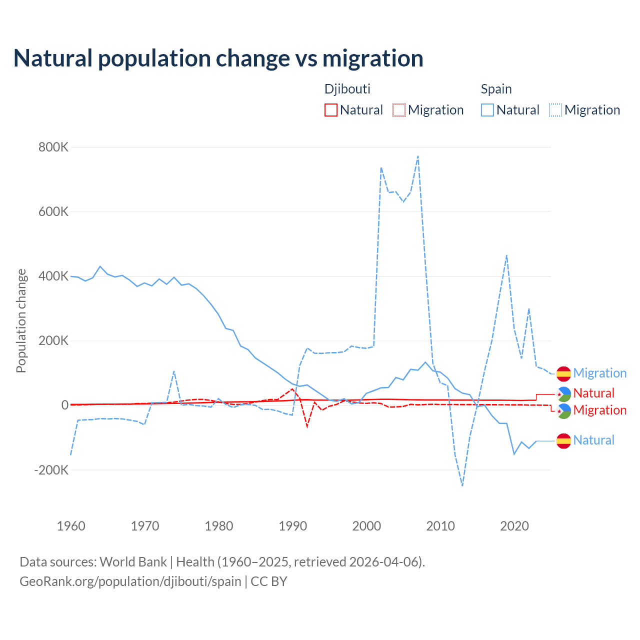 Over the last 10 years, 92.1% of the population change in Djibouti is from natural causes (a gain of 153,892 people) and 7.87% is from migration (a gain of 13,138 people). In Spain 25.8% is from natural causes (a loss of 627,829 people) and 74.2% is from migration (a gain of 1,810,127 people).