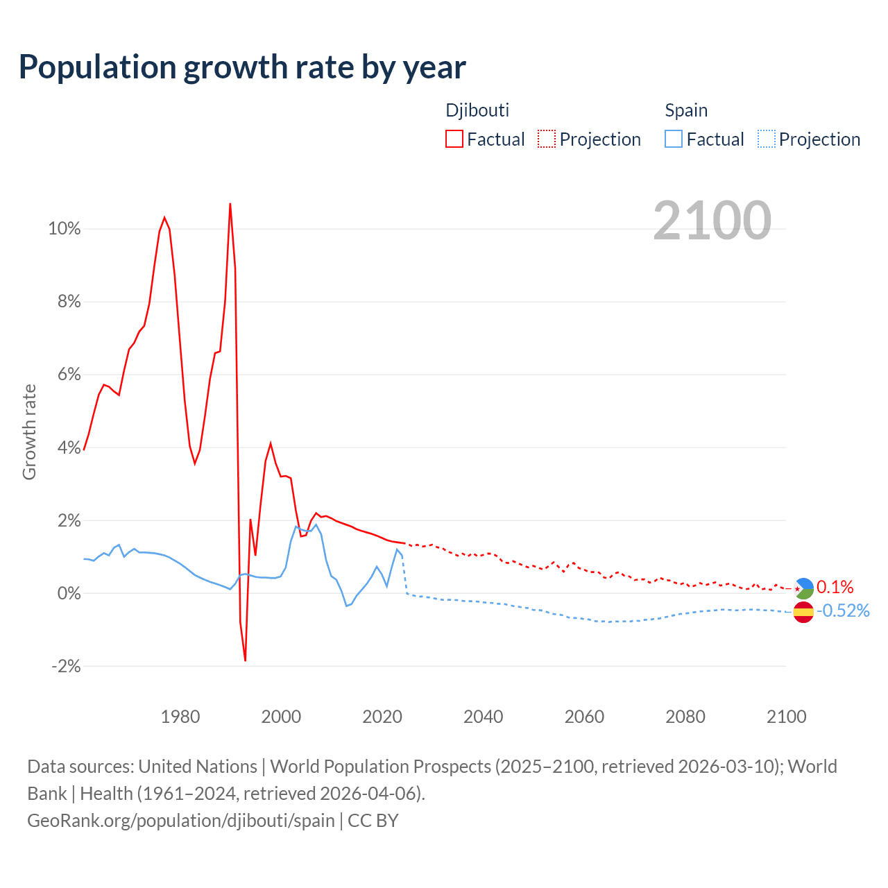 - For the last 10 years, Djibouti has had an average growth rate of +1.57% per year vs +0.43% in Spain.