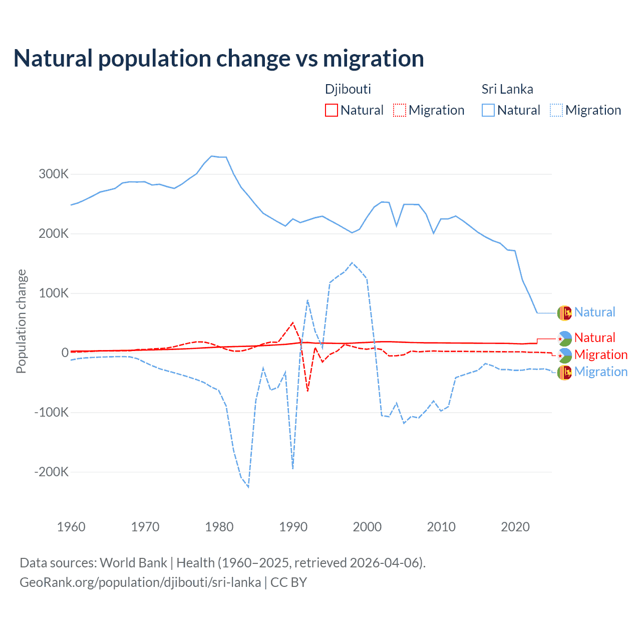 Over the last 10 years, 92.1% of the population change in Djibouti is from natural causes (a gain of 153,892 people) and 7.87% is from migration (a gain of 13,138 people). In Sri Lanka 85.3% is from natural causes (a gain of 1,605,749 people) and 14.7% is from migration (a loss of 276,121 people).