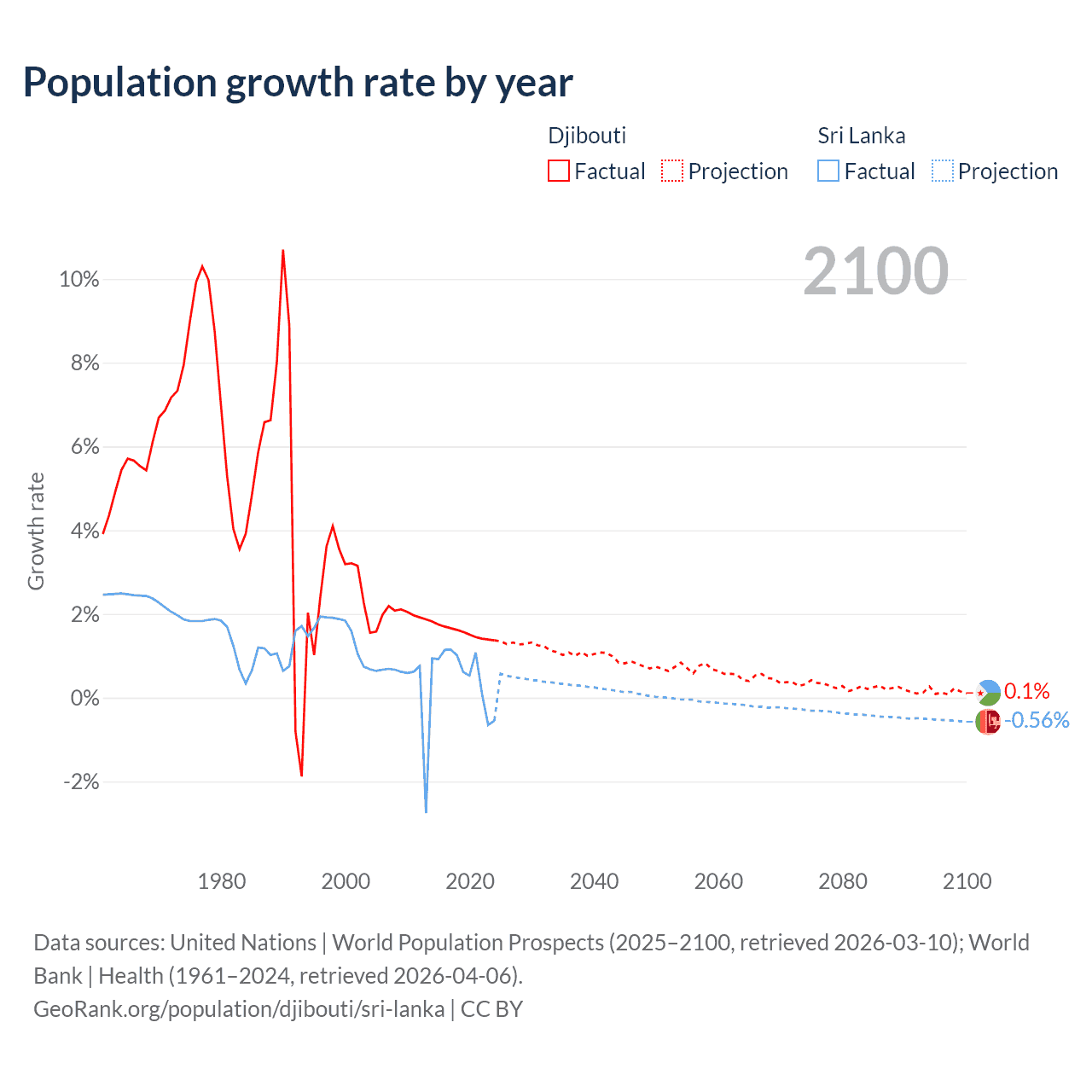 - For the last 10 years, Djibouti has had an average growth rate of +1.57% per year vs +0.57% in Sri Lanka.