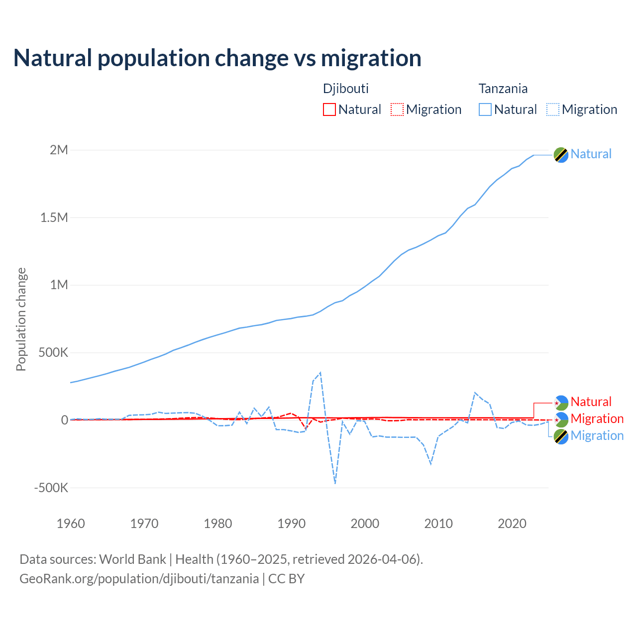 Over the last 10 years, 92.1% of the population change in Djibouti is from natural causes (a gain of 153,892 people) and 7.87% is from migration (a gain of 13,138 people). In Tanzania 98.7% is from natural causes (a gain of 17,769,541 people) and 1.27% is from migration (a gain of 229,466 people).