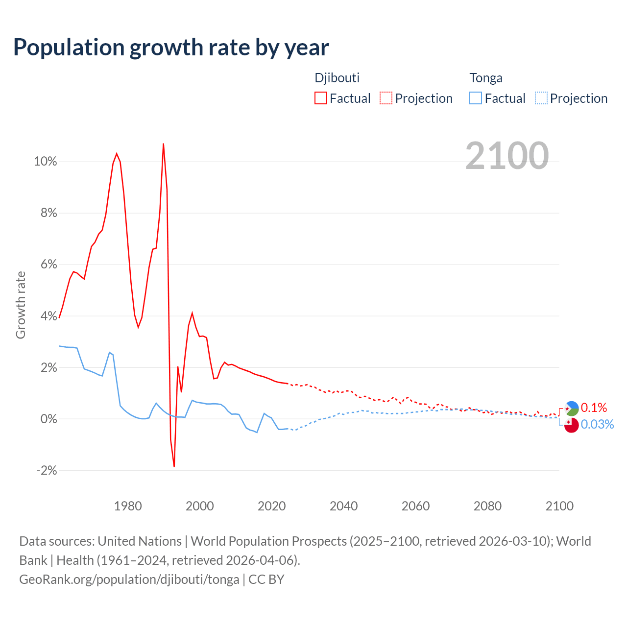 - For the last 10 years, Djibouti has had an average growth rate of +1.57% per year vs -0.25% in Tonga.