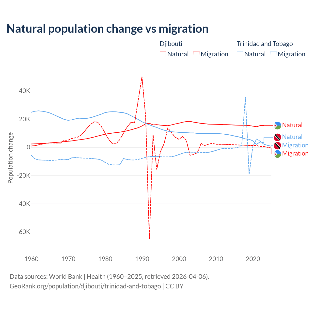 Over the last 10 years, 92.1% of the population change in Djibouti is from natural causes (a gain of 153,892 people) and 7.87% is from migration (a gain of 13,138 people). In Trinidad and Tobago 66% is from natural causes (a gain of 55,887 people) and 34% is from migration (a gain of 28,785 people).