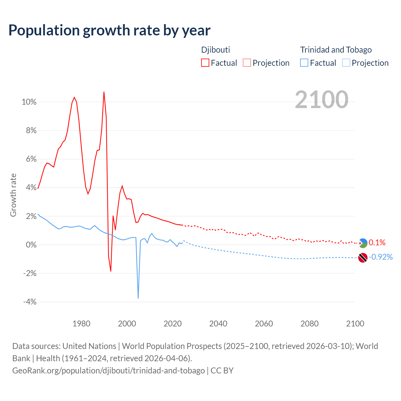 - For the last 10 years, Djibouti has had an average growth rate of +1.57% per year vs +0.19% in Trinidad and Tobago.