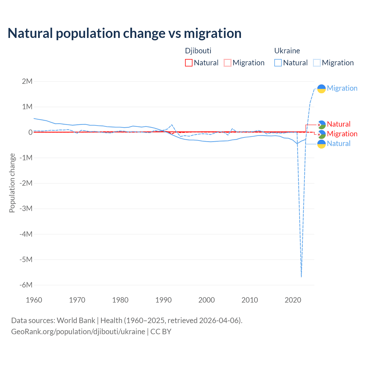 Over the last 10 years, 92.1% of the population change in Djibouti is from natural causes (a gain of 153,892 people) and 7.87% is from migration (a gain of 13,138 people). In Ukraine 28.2% is from natural causes (a loss of 2,435,153 people) and 71.8% is from migration (a loss of 6,198,995 people).