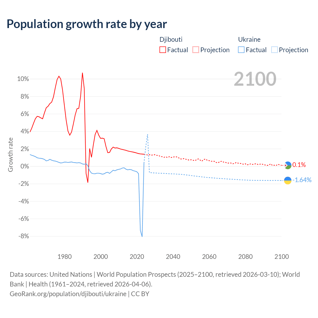 - For the last 10 years, Djibouti has had an average growth rate of +1.57% per year vs -1.74% in Ukraine.