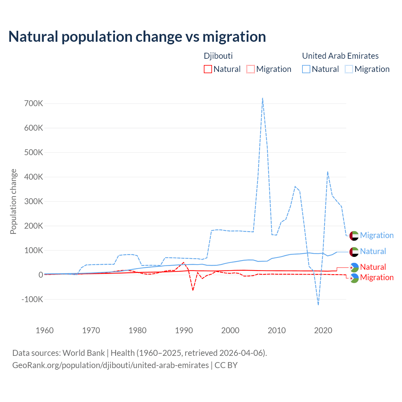 Over the last 10 years, 92.1% of the population change in Djibouti is from natural causes (a gain of 153,892 people) and 7.87% is from migration (a gain of 13,138 people). In the United Arab Emirates 30.5% is from natural causes (a gain of 857,996 people) and 69.5% is from migration (a gain of 1,958,520 people).