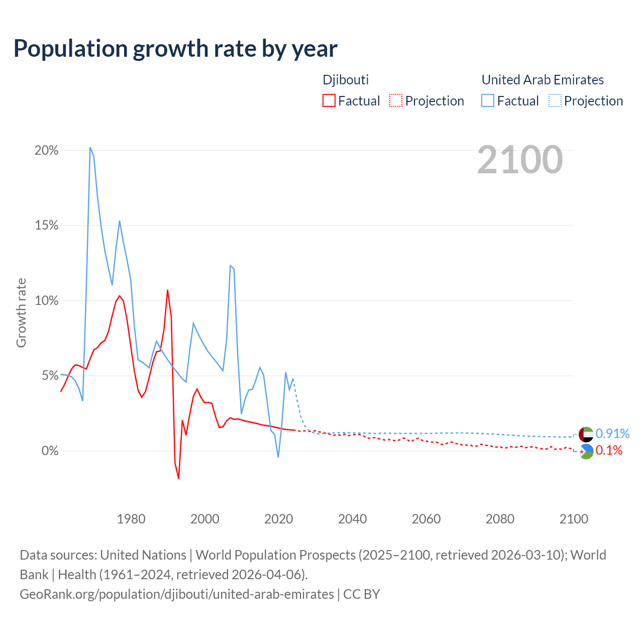 - For the last 10 years, Djibouti has had an average growth rate of +1.57% per year vs +3.31% in the United Arab Emirates.