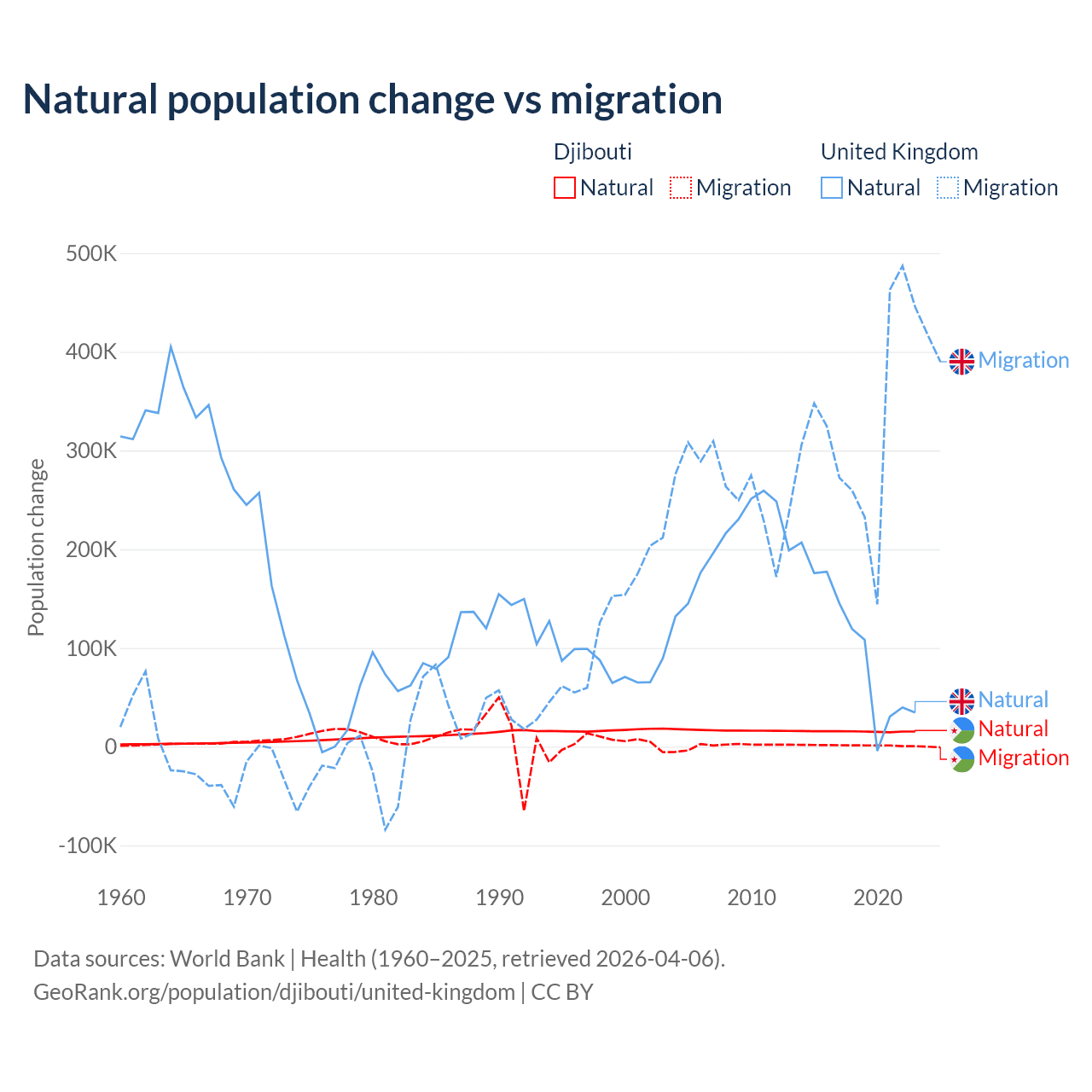 Over the last 10 years, 92.1% of the population change in Djibouti is from natural causes (a gain of 153,892 people) and 7.87% is from migration (a gain of 13,138 people). In the United Kingdom 23.9% is from natural causes (a gain of 1,033,129 people) and 76.1% is from migration (a gain of 3,283,101 people).