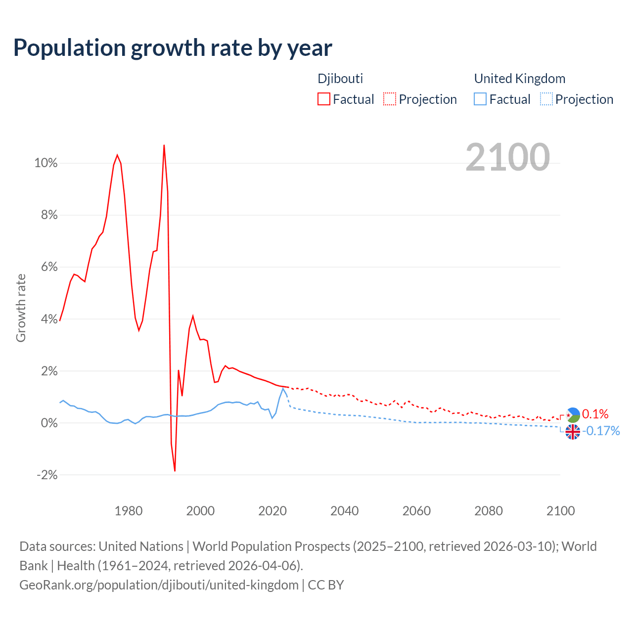 - For the last 10 years, Djibouti has had an average growth rate of +1.57% per year vs +0.7% in the United Kingdom.