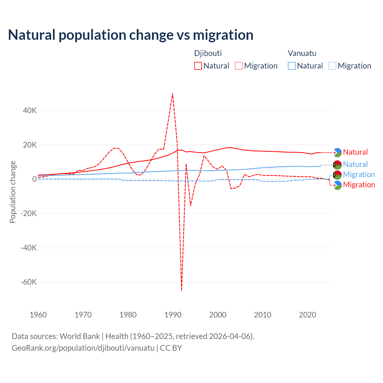 Over the last 10 years, 92.1% of the population change in Djibouti is from natural causes (a gain of 153,892 people) and 7.87% is from migration (a gain of 13,138 people). In Vanuatu 92.2% is from natural causes (a gain of 72,941 people) and 7.81% is from migration (a loss of 6,181 people).