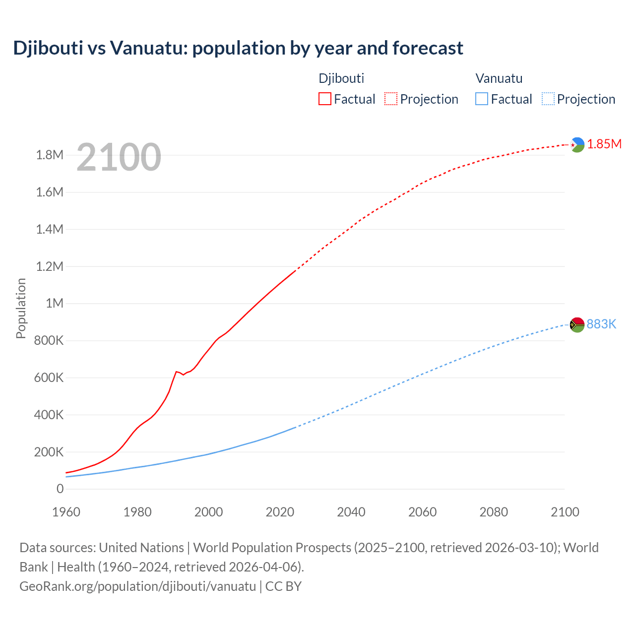 The latest officially reported population of Djibouti was 1,168,722 in 2024 vs 327,777 people in Vanuatu in 2024. In 2026, based on the adjusted UN estimation, the current Djibouti's population is 1,203,929 people compared to 344,750 in Vanuatu.