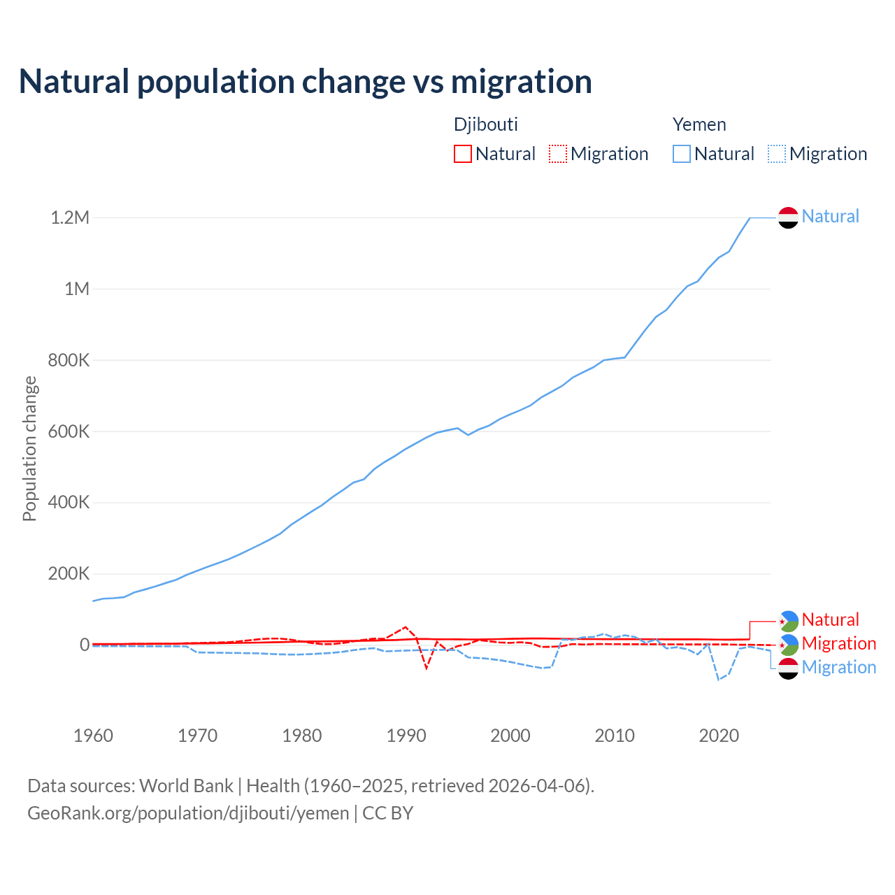 Over the last 10 years, 92.1% of the population change in Djibouti is from natural causes (a gain of 153,892 people) and 7.87% is from migration (a gain of 13,138 people). In Yemen 97.8% is from natural causes (a gain of 10,460,813 people) and 2.17% is from migration (a loss of 231,814 people).