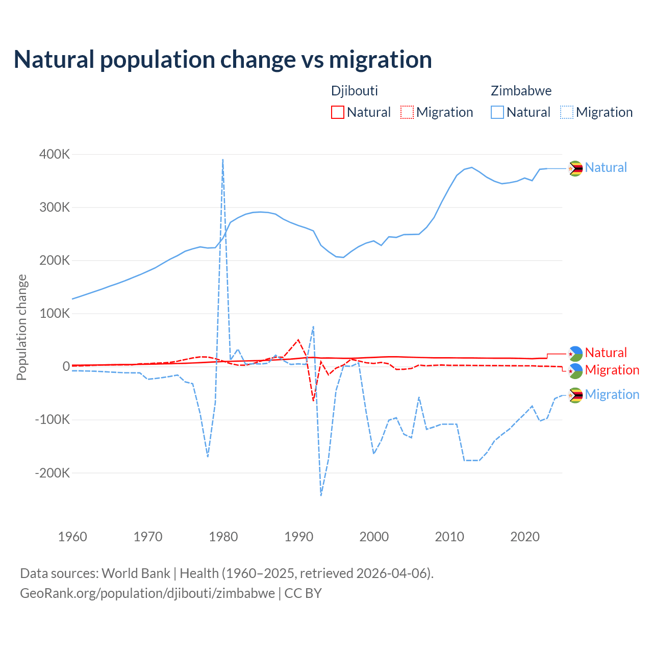 Over the last 10 years, 92.1% of the population change in Djibouti is from natural causes (a gain of 153,892 people) and 7.87% is from migration (a gain of 13,138 people). In Zimbabwe 74.9% is from natural causes (a gain of 3,558,487 people) and 25.1% is from migration (a loss of 1,192,807 people).