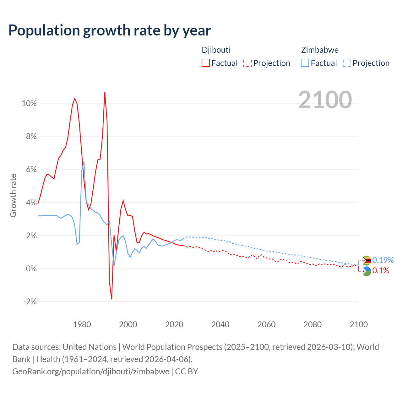 - For the last 10 years, Djibouti has had an average growth rate of +1.57% per year vs +1.57% in Zimbabwe.