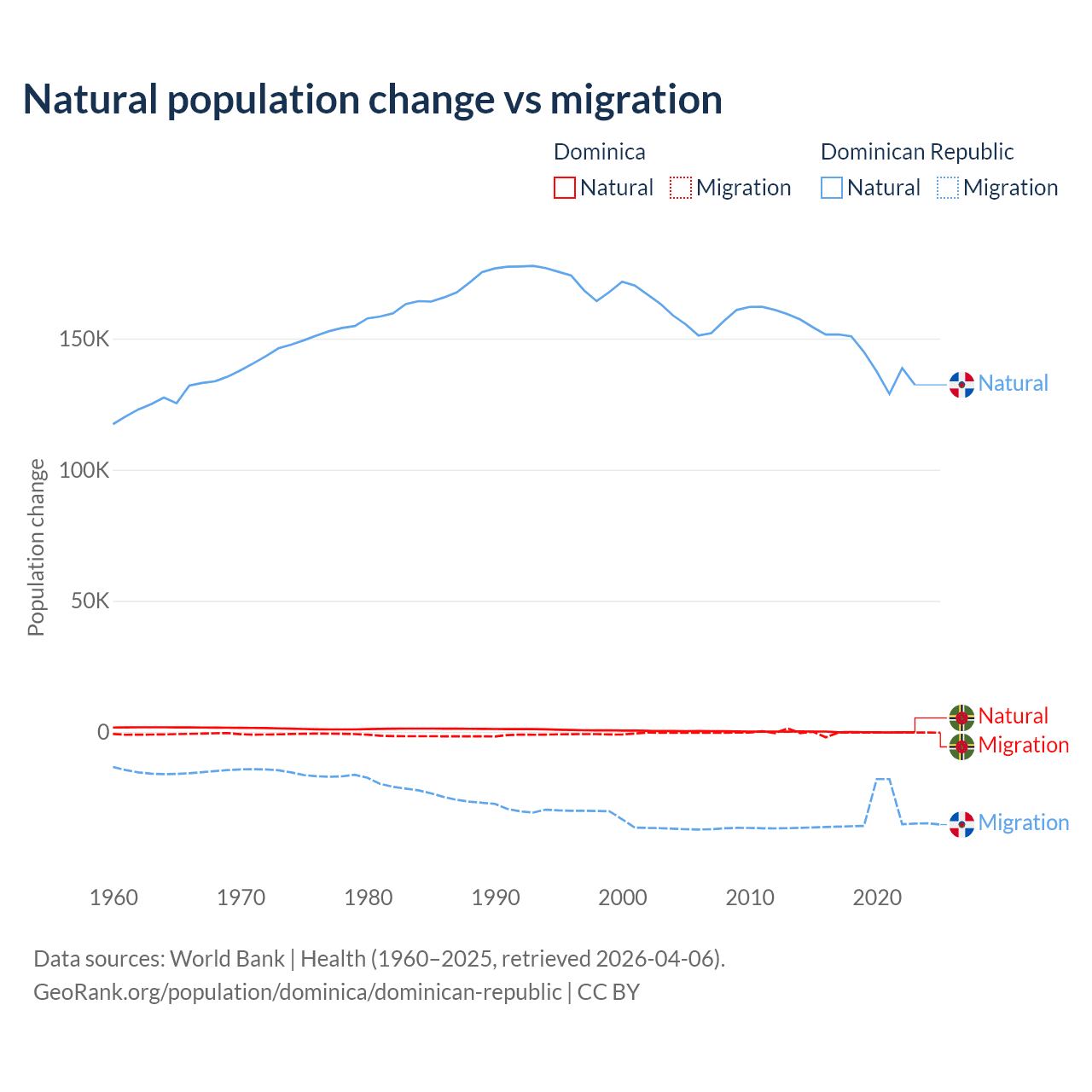 Over the last 10 years, 4.63% of the population change in Dominica is from natural causes (a loss of 190 people) and 95.4% is from migration (a loss of 3,914 people). In the Dominican Republic 81.8% is from natural causes (a gain of 1,447,764 people) and 18.2% is from migration (a loss of 322,919 people).