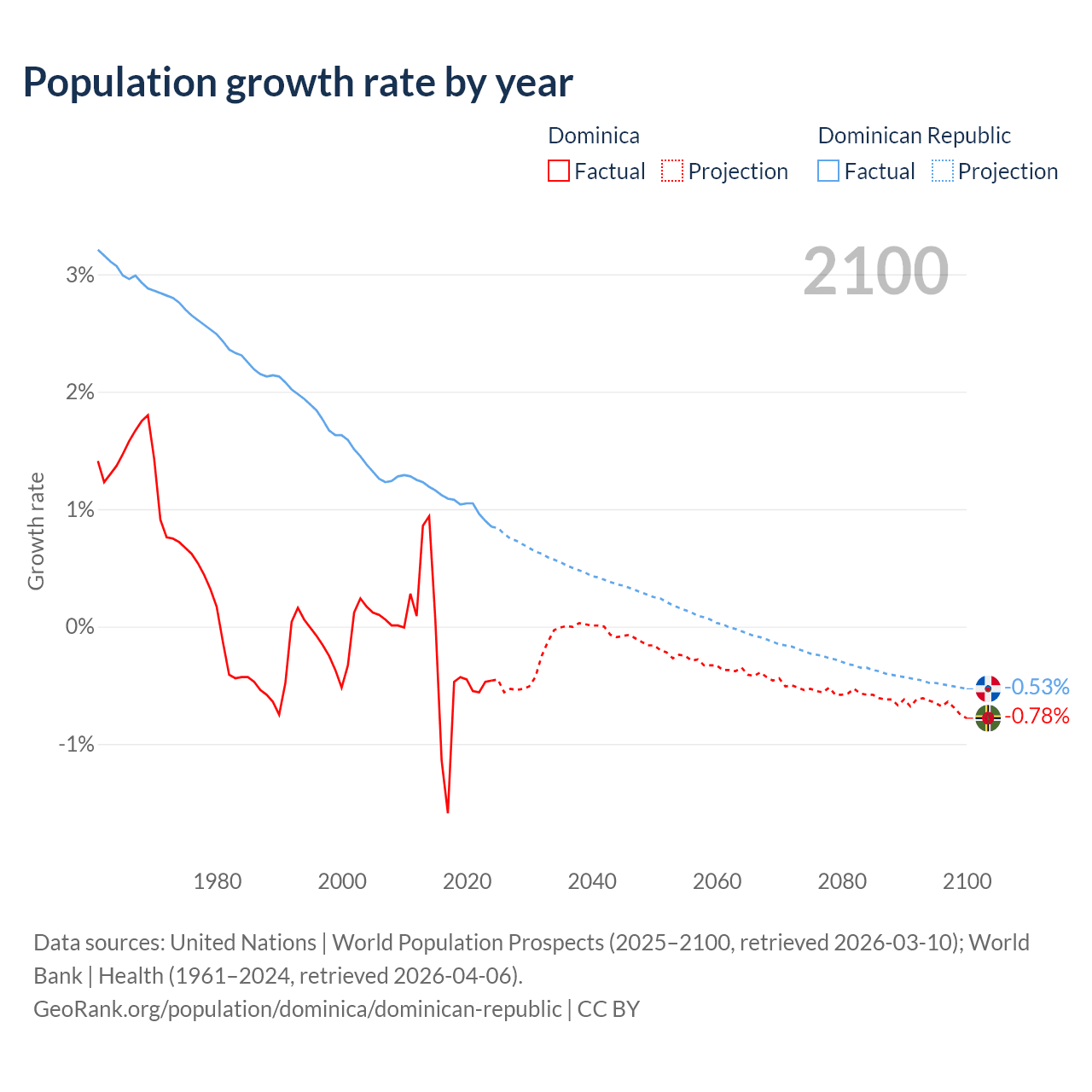 - For the last 10 years, Dominica has had an average growth rate of -0.47% per year vs +1.04% in the Dominican Republic.