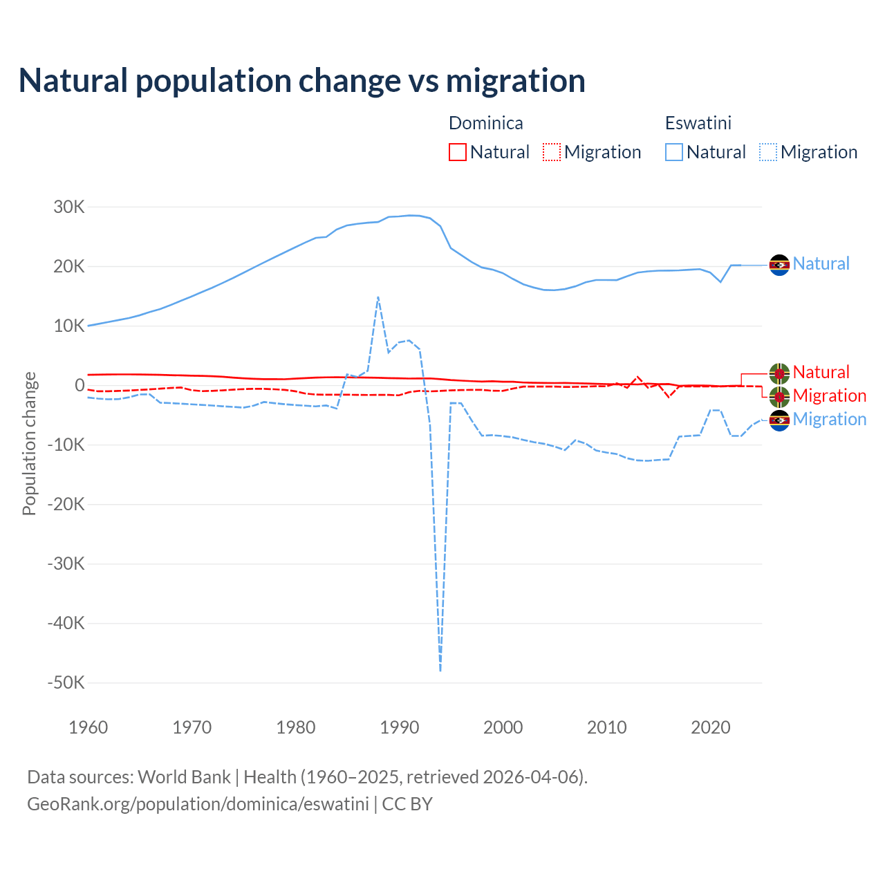 Over the last 10 years, 4.63% of the population change in Dominica is from natural causes (a loss of 190 people) and 95.4% is from migration (a loss of 3,914 people). In Eswatini 68.3% is from natural causes (a gain of 192,206 people) and 31.7% is from migration (a loss of 89,012 people).