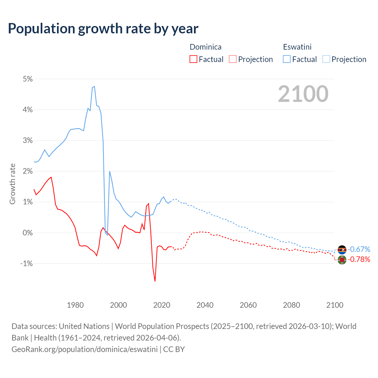 - For the last 10 years, Dominica has had an average growth rate of -0.47% per year vs +0.87% in Eswatini.