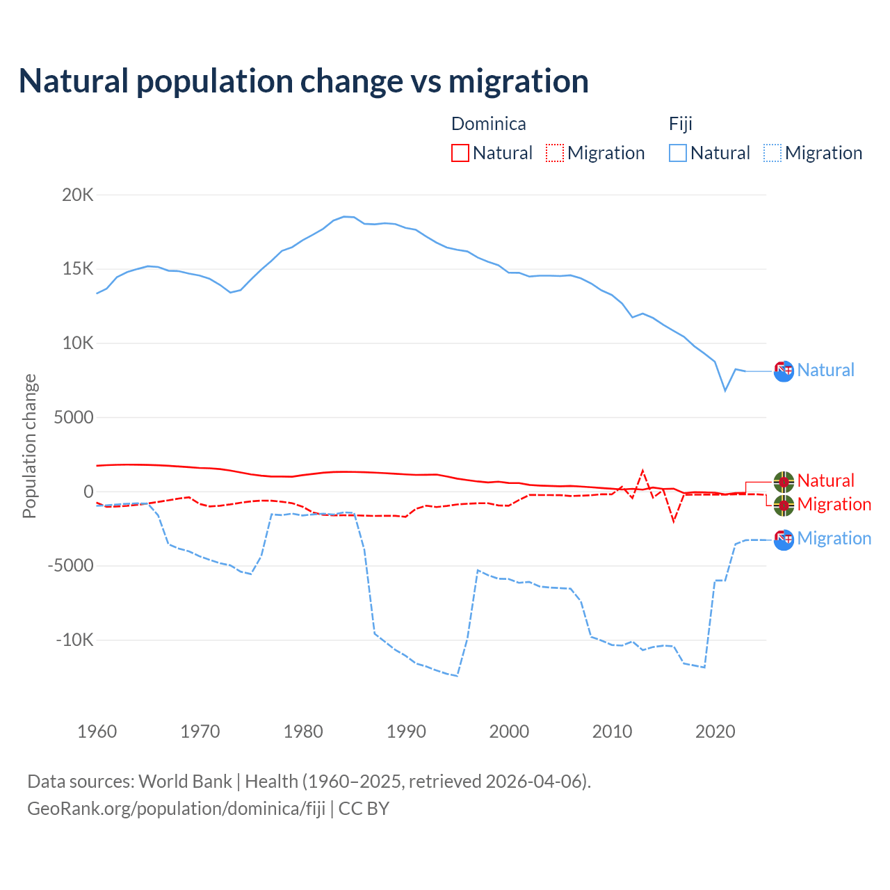 Over the last 10 years, 4.63% of the population change in Dominica is from natural causes (a loss of 190 people) and 95.4% is from migration (a loss of 3,914 people). In Fiji 52.6% is from natural causes (a gain of 94,971 people) and 47.4% is from migration (a loss of 85,415 people).