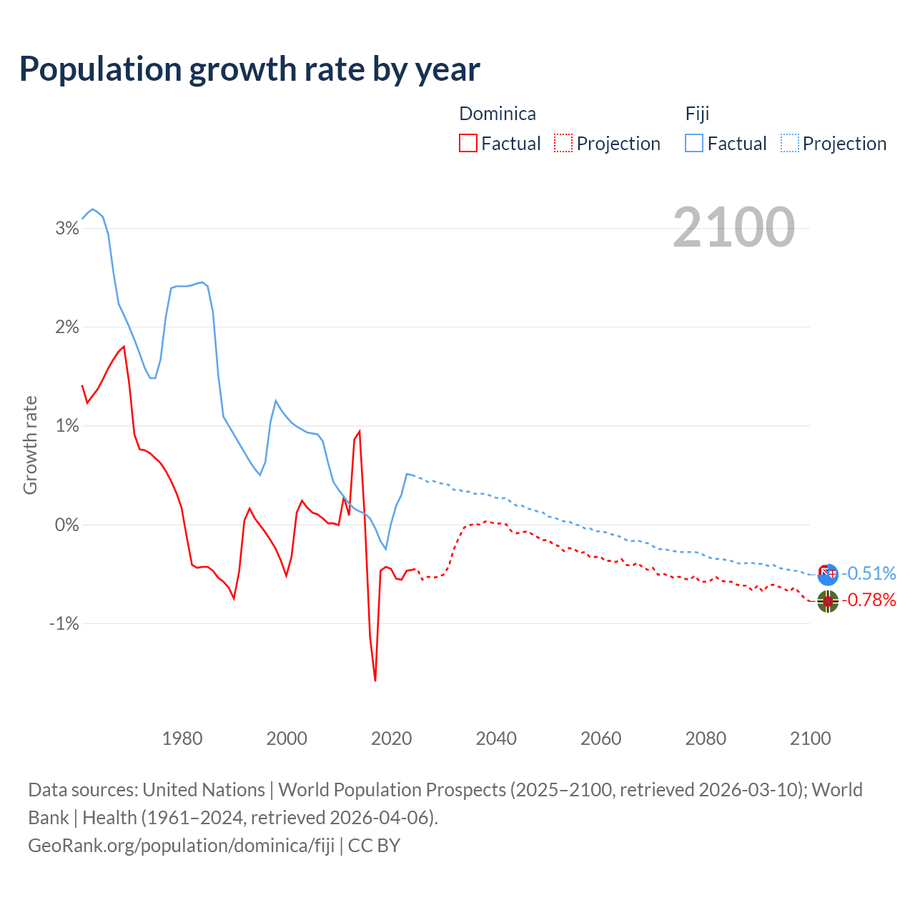 - For the last 10 years, Dominica has had an average growth rate of -0.47% per year vs +0.12% in Fiji.
