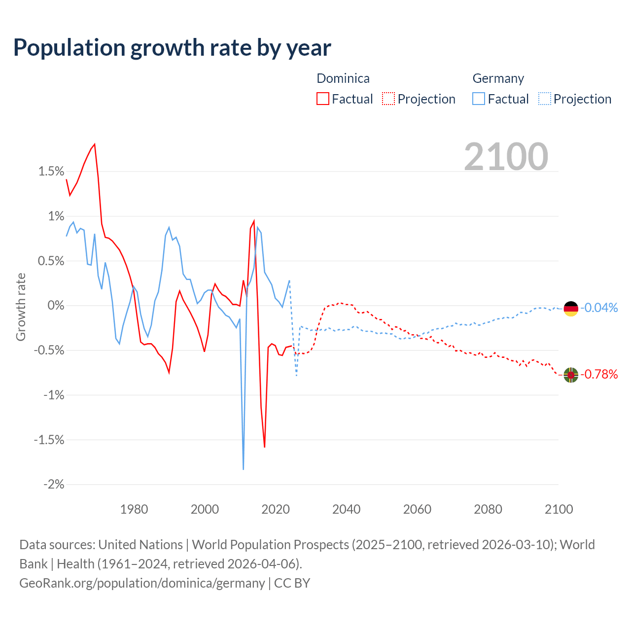 - For the last 10 years, Dominica has had an average growth rate of -0.47% per year vs +0.32% in Germany.