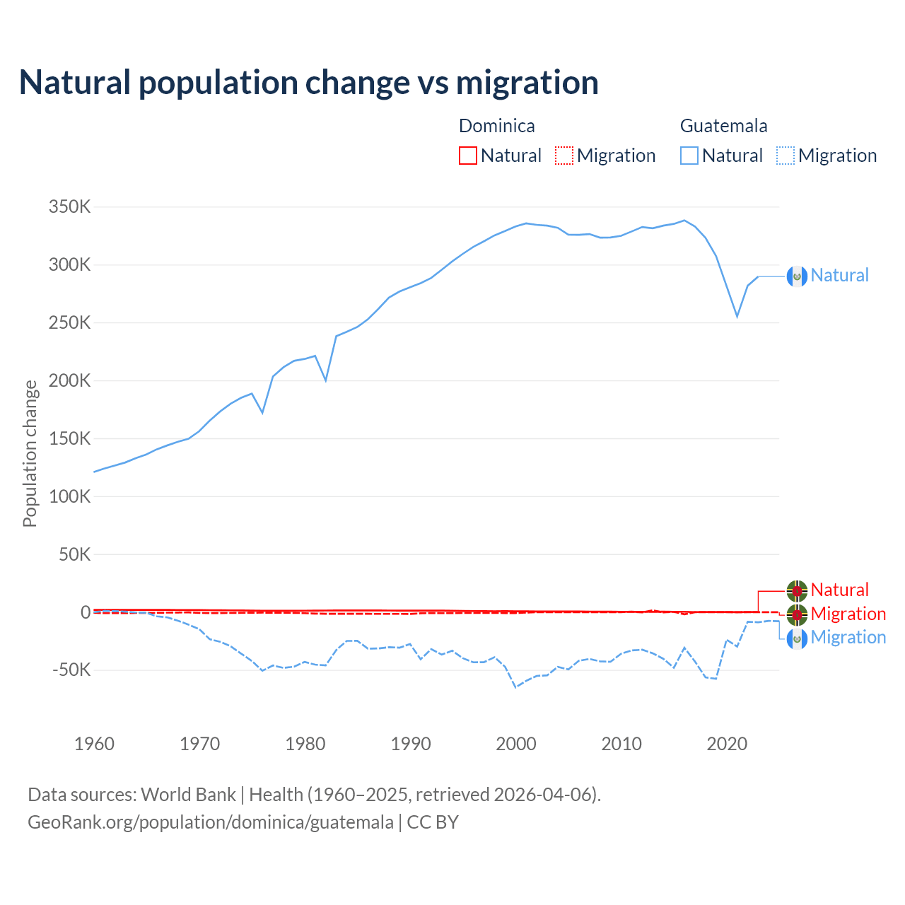Over the last 10 years, 4.63% of the population change in Dominica is from natural causes (a loss of 190 people) and 95.4% is from migration (a loss of 3,914 people). In Guatemala 89.8% is from natural causes (a gain of 3,077,847 people) and 10.2% is from migration (a loss of 347,818 people).