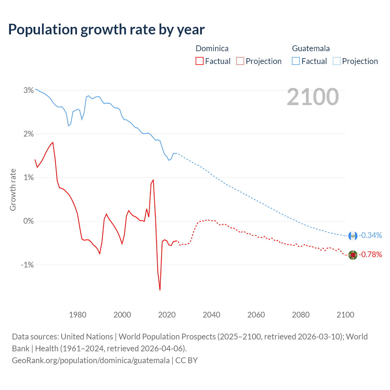 - For the last 10 years, Dominica has had an average growth rate of -0.47% per year vs +1.64% in Guatemala.