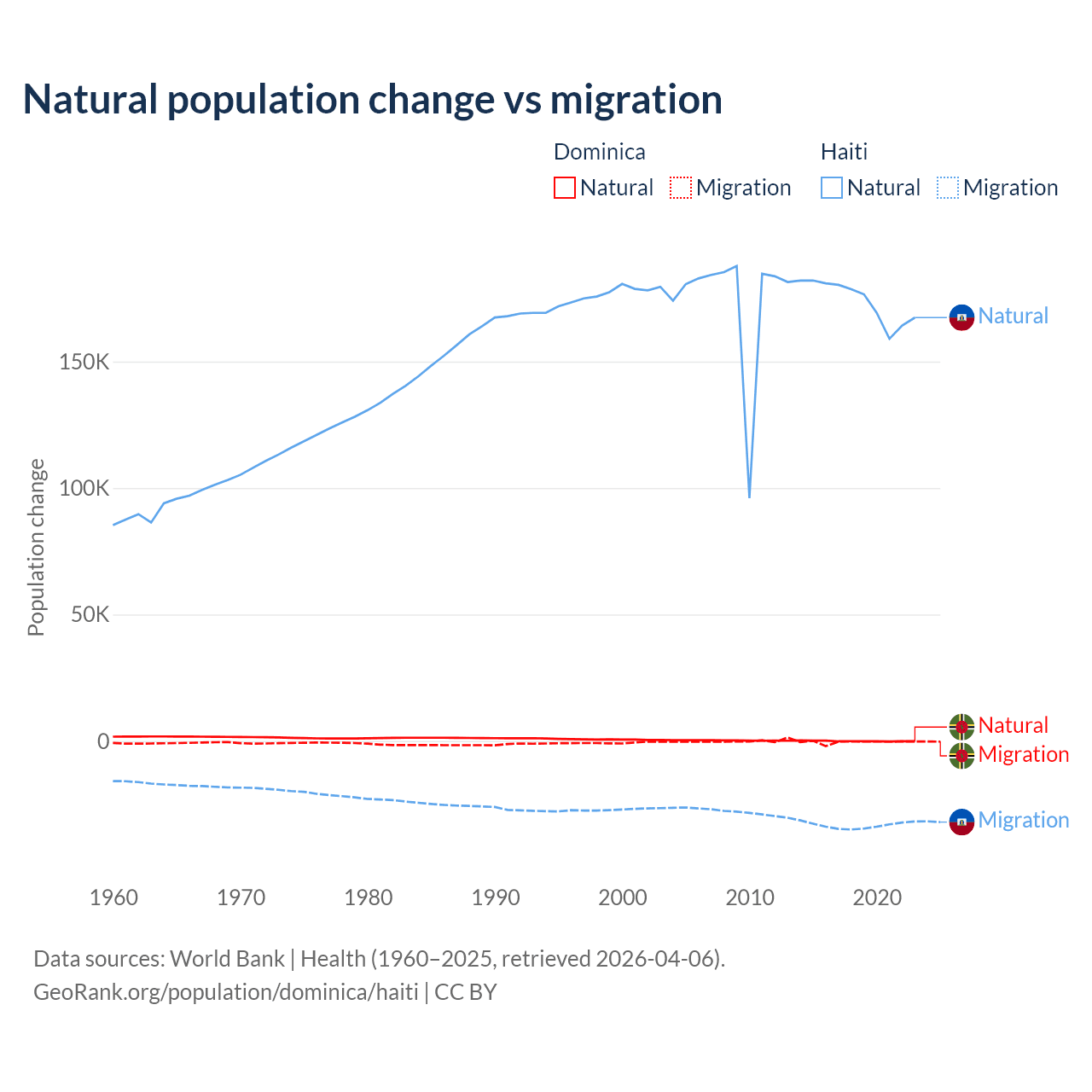Over the last 10 years, 4.63% of the population change in Dominica is from natural causes (a loss of 190 people) and 95.4% is from migration (a loss of 3,914 people). In Haiti 83.9% is from natural causes (a gain of 1,740,319 people) and 16.1% is from migration (a loss of 333,076 people).