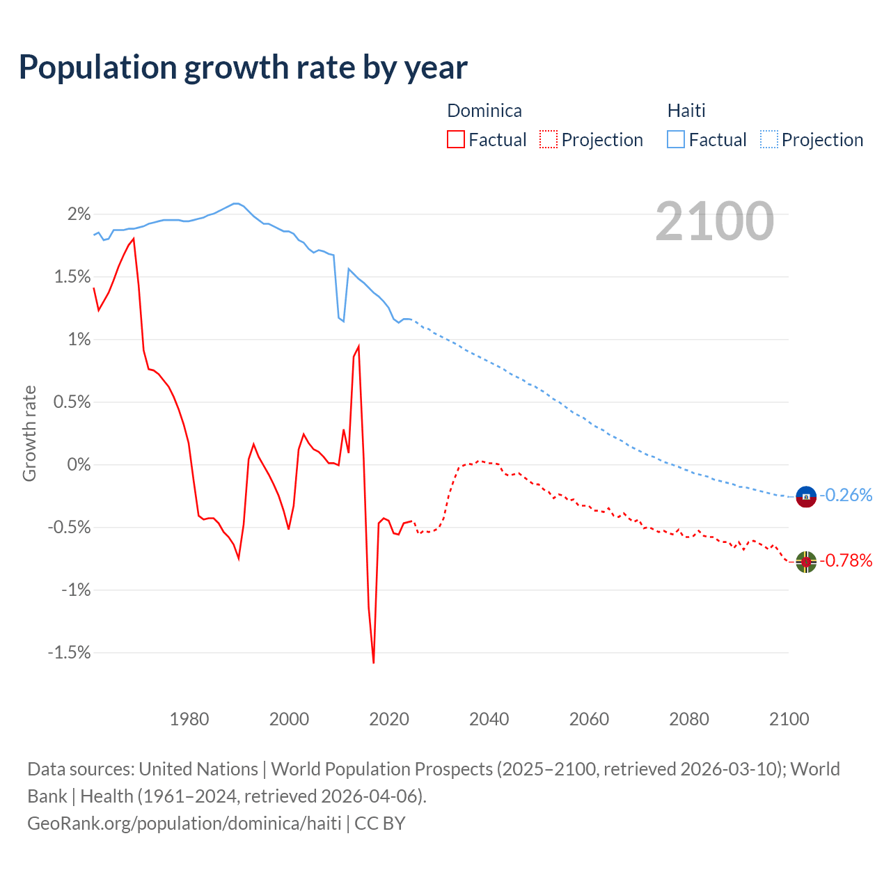 - For the last 10 years, Dominica has had an average growth rate of -0.47% per year vs +1.29% in Haiti.
