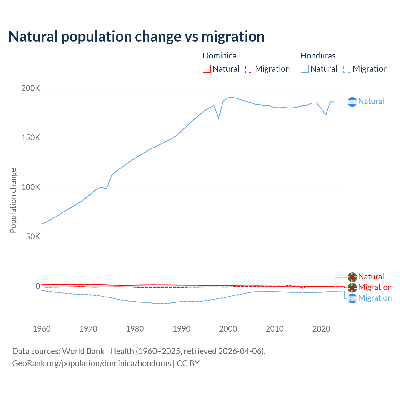 Over the last 10 years, 4.63% of the population change in Dominica is from natural causes (a loss of 190 people) and 95.4% is from migration (a loss of 3,914 people). In Honduras 96.7% is from natural causes (a gain of 1,821,125 people) and 3.29% is from migration (a loss of 61,965 people).