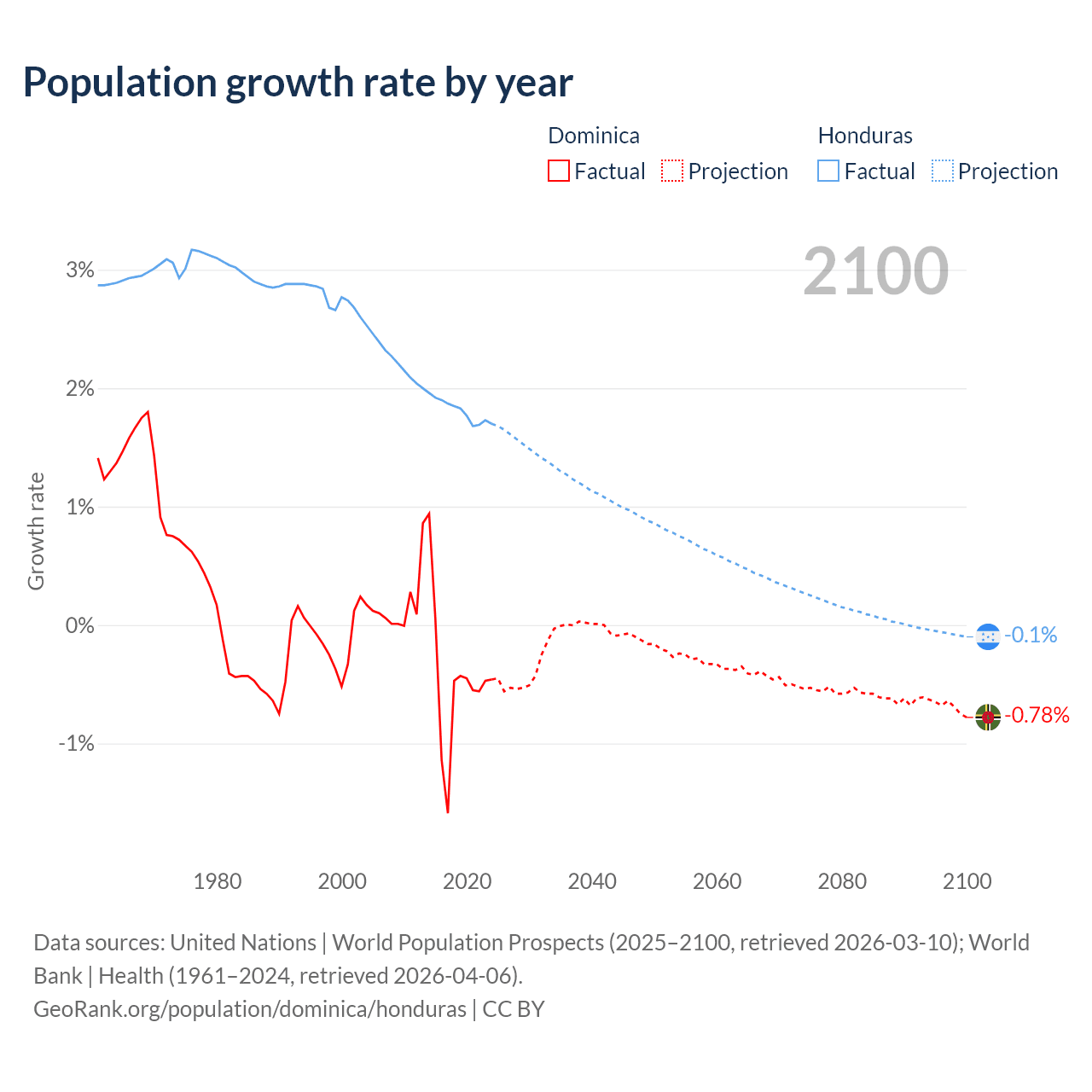 - Since 2006, the population of Dominica has decreased from 68.8K people to 65.5K (4.75% decline), while Honduras has grown from 7.66M to 11.2M (46.8% growth).