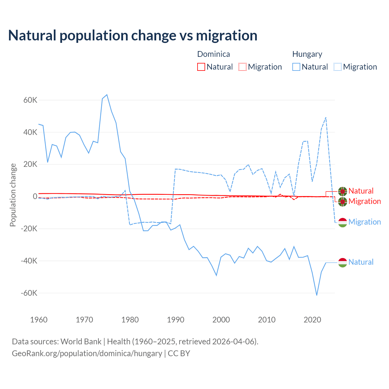Over the last 10 years, 4.63% of the population change in Dominica is from natural causes (a loss of 190 people) and 95.4% is from migration (a loss of 3,914 people). In Hungary 63.7% is from natural causes (a loss of 412,838 people) and 36.3% is from migration (a gain of 234,837 people).