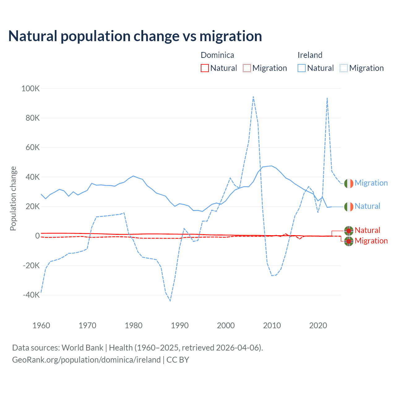 Over the last 10 years, 4.63% of the population change in Dominica is from natural causes (a loss of 190 people) and 95.4% is from migration (a loss of 3,914 people). In Ireland 48.2% is from natural causes (a gain of 284,644 people) and 51.8% is from migration (a gain of 305,297 people).