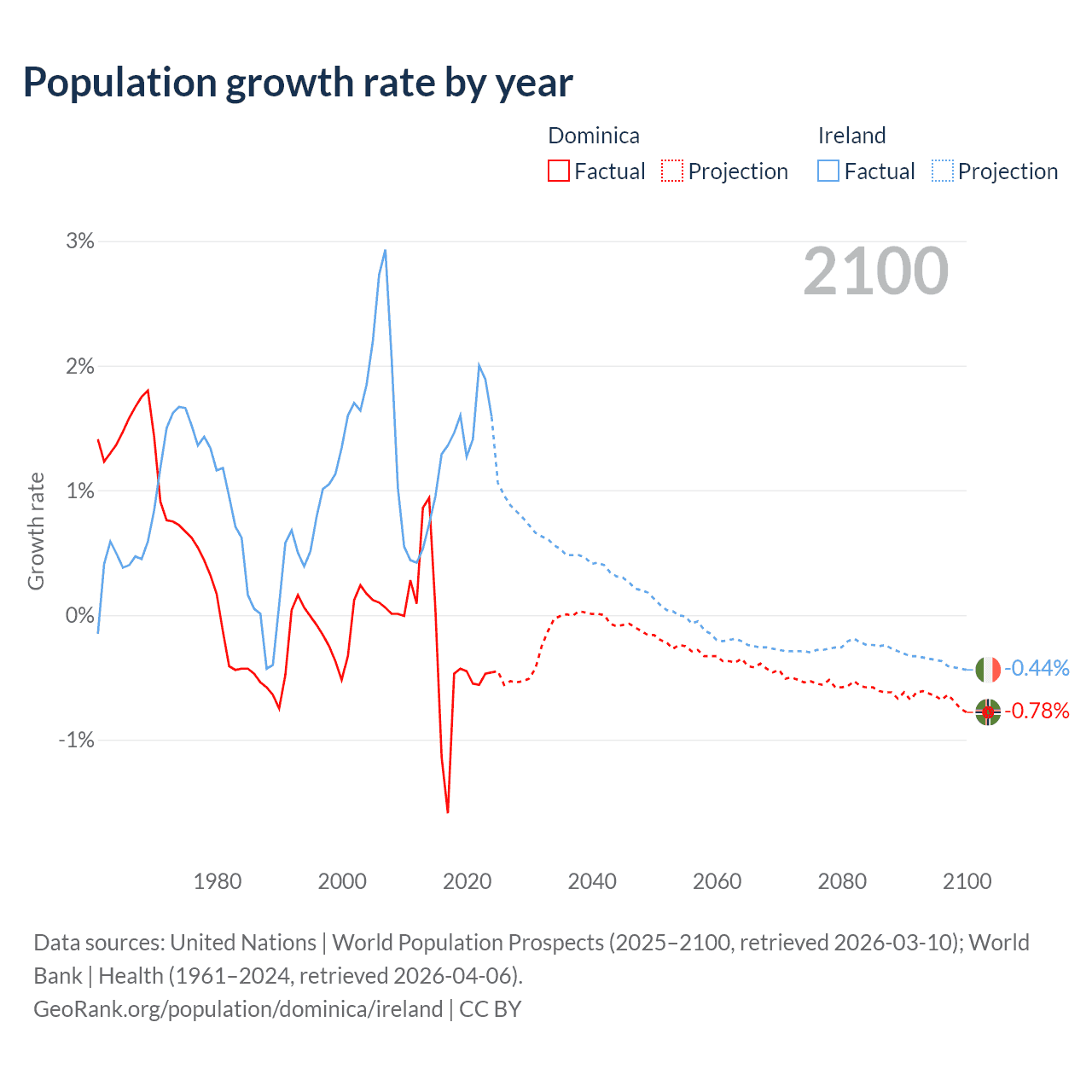 - For the last 10 years, Dominica has had an average growth rate of -0.47% per year vs +1.41% in Ireland.