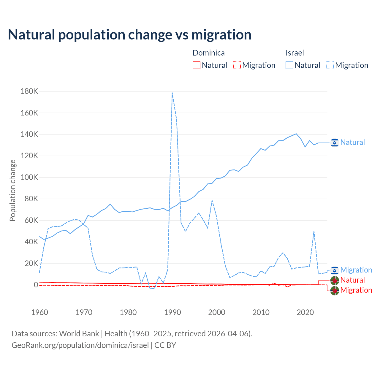 Over the last 10 years, 4.63% of the population change in Dominica is from natural causes (a loss of 190 people) and 95.4% is from migration (a loss of 3,914 people). In Israel 86% is from natural causes (a gain of 1,343,492 people) and 14% is from migration (a gain of 219,048 people).