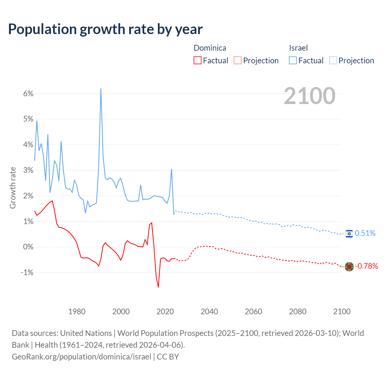 - For the last 10 years, Dominica has had an average growth rate of -0.47% per year vs +1.96% in Israel.
