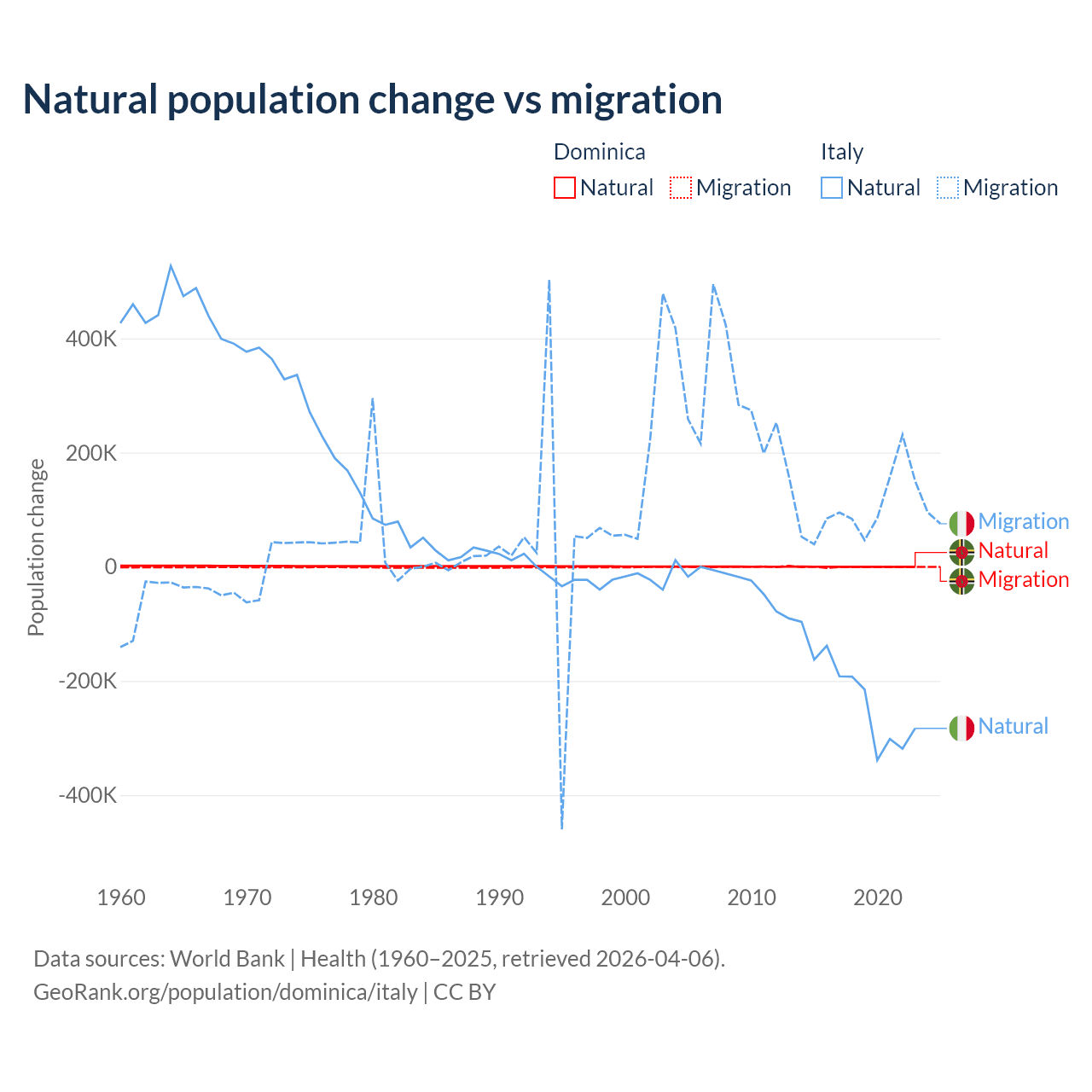 Over the last 10 years, 4.63% of the population change in Dominica is from natural causes (a loss of 190 people) and 95.4% is from migration (a loss of 3,914 people). In Italy 68.6% is from natural causes (a loss of 2,239,084 people) and 31.4% is from migration (a gain of 1,026,128 people).
