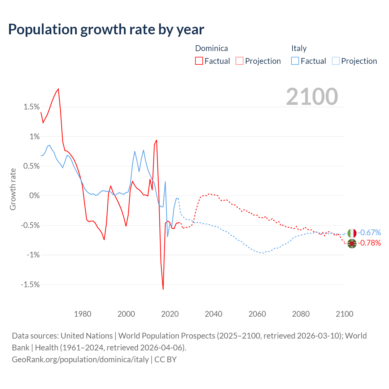 - For the last 10 years, Dominica has had an average growth rate of -0.47% per year vs -0.21% in Italy.