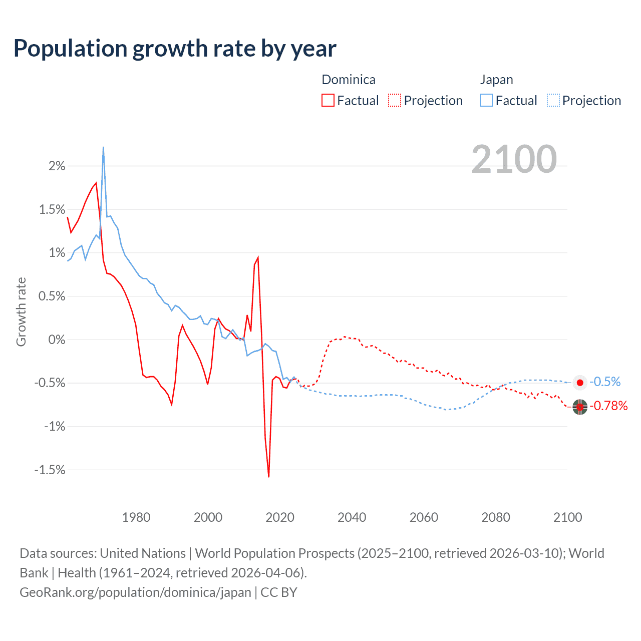 - For the last 10 years, Dominica has had an average growth rate of -0.47% per year vs -0.25% in Japan.