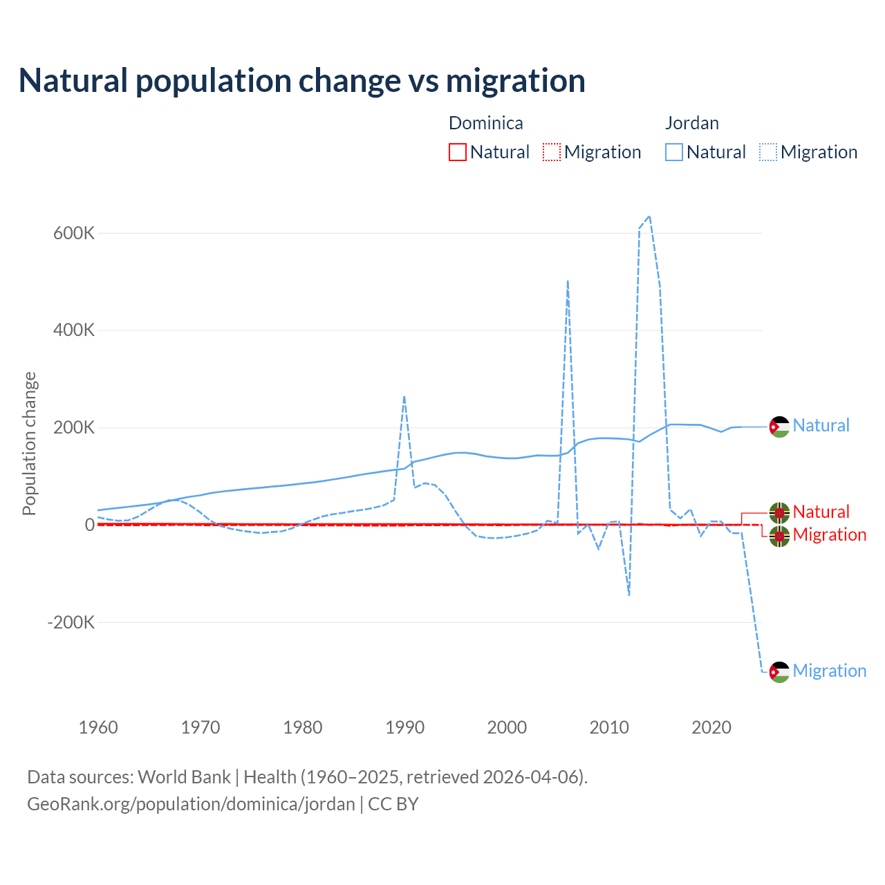 Over the last 10 years, 4.63% of the population change in Dominica is from natural causes (a loss of 190 people) and 95.4% is from migration (a loss of 3,914 people). In Jordan 63.2% is from natural causes (a gain of 1,991,452 people) and 36.8% is from migration (a gain of 1,157,625 people).
