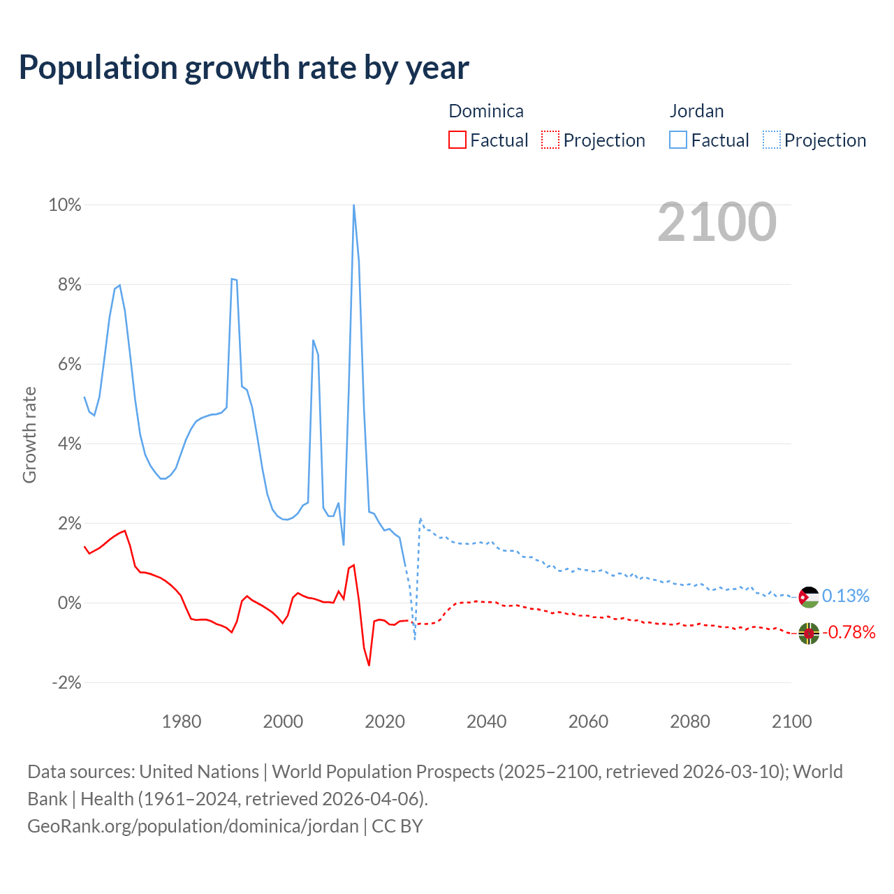 - For the last 10 years, Dominica has had an average growth rate of -0.47% per year vs +3.45% in Jordan.