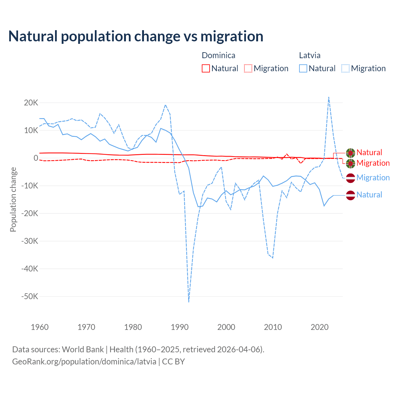 Over the last 10 years, 4.63% of the population change in Dominica is from natural causes (a loss of 190 people) and 95.4% is from migration (a loss of 3,914 people). In Latvia 82.7% is from natural causes (a loss of 103,711 people) and 17.3% is from migration (a loss of 21,641 people).