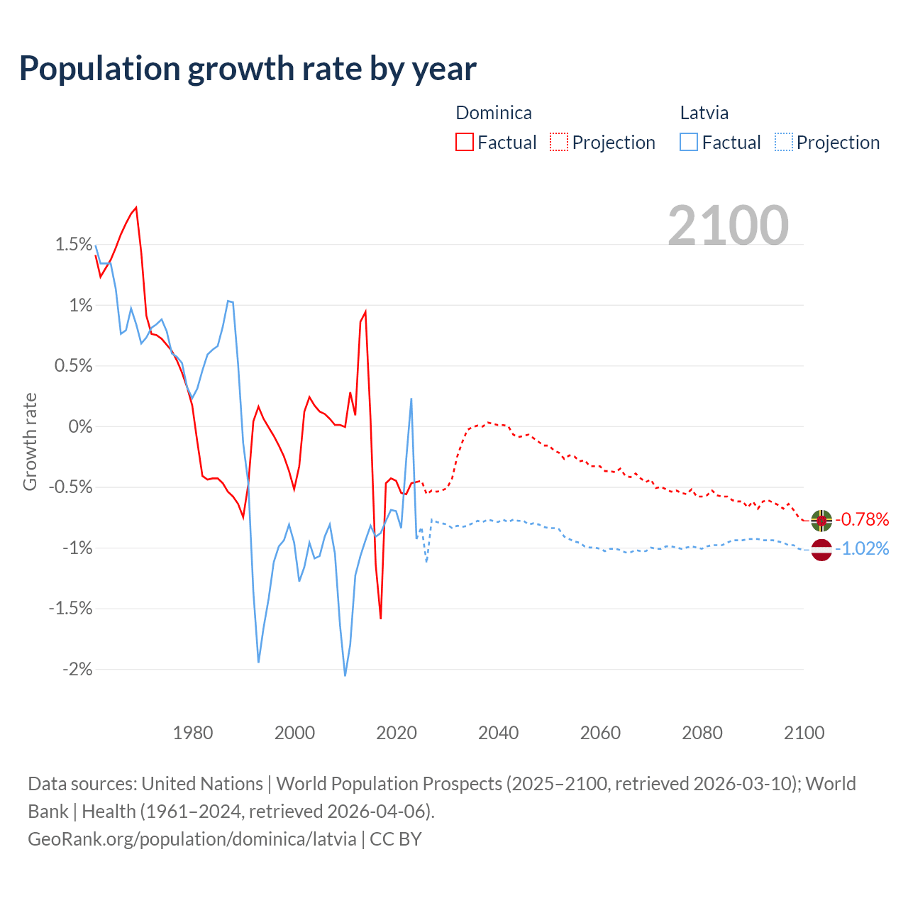 - For the last 10 years, Dominica has had an average growth rate of -0.47% per year vs -0.68% in Latvia.