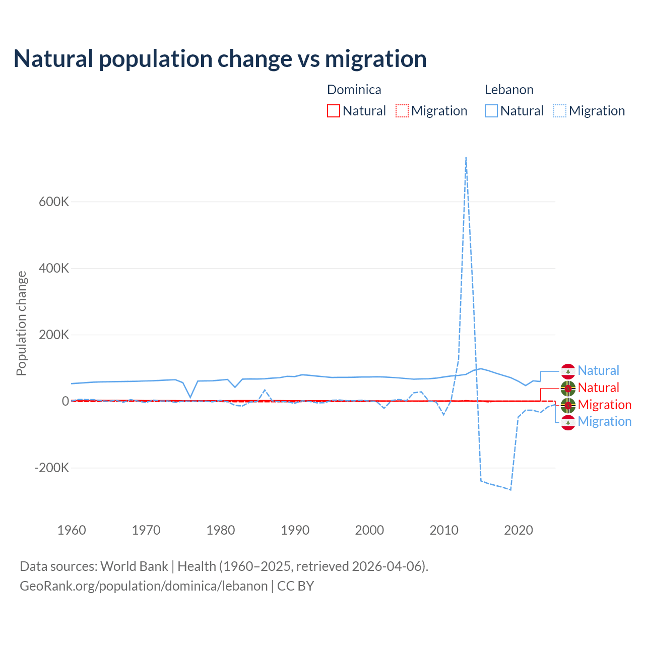 Over the last 10 years, 4.63% of the population change in Dominica is from natural causes (a loss of 190 people) and 95.4% is from migration (a loss of 3,914 people). In Lebanon 40.1% is from natural causes (a gain of 739,256 people) and 59.9% is from migration (a loss of 1,103,772 people).